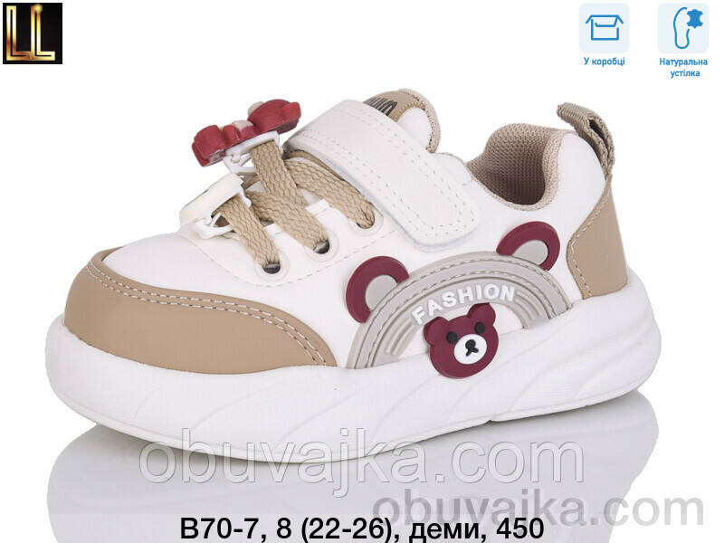 Ця модель дитячих кросівок вироблена з еко шкіри.Підошва у дитячих кросівках виготовлена з гуми. Внутрішня частина дитячих кросівок – текстиль. Кросівки дуже легкі та зручні.На ногі такі дитячі кросівки виглядають красиво та акуратно. Розміри з 22-26. У ящику 8 пар Мінімальне замовлення 8 пар.
